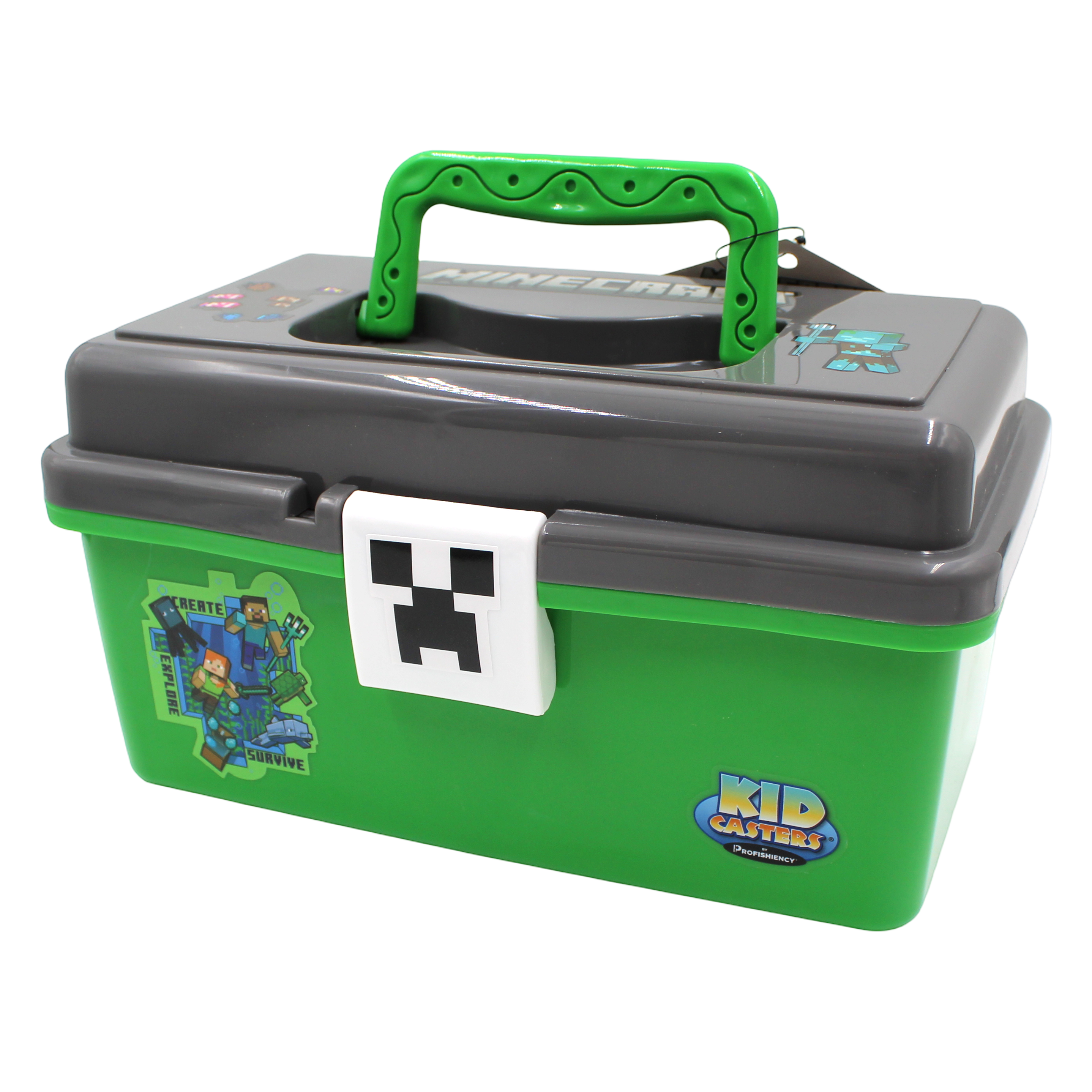 Your little angler can now take Minecraft Steve on their next outdoor adventure with the Minecraft Play Box. This is the perfect youth play box for hitting the lake, pond, or stream.  This handy play box features a removeable tray for easy access, as well an easy locking latch to keep your lures secure.
