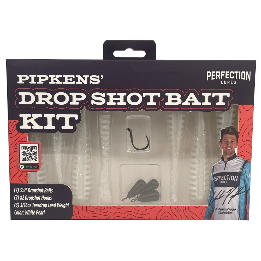 The Pipken’s Drop Shot Bait Kits come with seven 3-3/4 Dropshot Baits, two #2 Dropshot hooks, three 3/16oz teardrop lead weights and comes in colors: Green Pumpkin, Smoke Show, and White Pearl. Whether you are drop shotting for aggressive smallmouth or fishing deep for finicky largemouth, Pipkens’ 3.75” Drop Shot baits perfectly resembles smaller baitfish. The flat bottom design allows the bait to sit neutrally in the water and not roll on you for a natural horizontal presentation. The upper channel on top of the body helps keep the bait horizontal and allows for a better hook up ratio when the bait balls up on the hook. The bait features a vertical tail for life-like action and the perfect salt ratio that creates a neutral buoyancy. The thicker nose section allows for increased durability and multiple fish catches. Pipkens’ Drop Shot Bait is great for many other finesse techniques, Texas rigging, and its naturally horizontal design makes it perfect for using with forward facing sonar.
