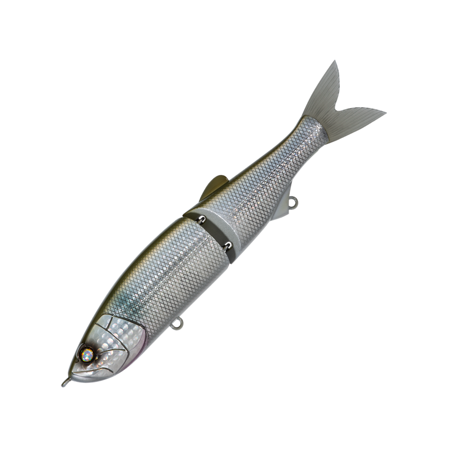 WHIPLASH FACTORY's first jointed lipless minnow. It swims seductively in a wide slalom with a short travel distance during retrieval, and its movement is also transmitted to your hand. With a light twitch, it darts left and right, and with fine continuous operation, it develops a writhing action under the water surface, driving the target crazy. The body thickness is set to 1.5 mm, assuming a strong target with teeth and jaws. The hook is one size larger than the general model of the same type, and the hook-up rate is also improved.